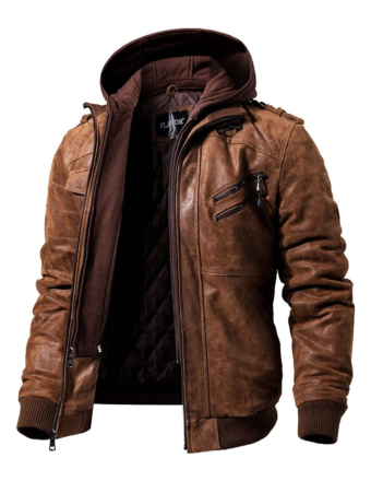 FLAVOR Men Brown Leather Motorcycle Jacket with Removable Hood